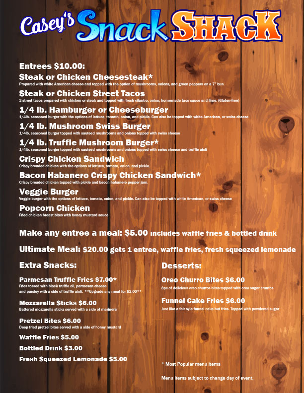 Casey's Concessions LLC was formed in July of 2015. World of Subs was their first concession trailer traveling Ohio county fairs and festivals. Expansion happened each year with numerous concession trailers. Casey's Cheesesteaks, Casey's Kabobs, Casey's Edible Cookie Dough, and Rosie's Nachos. Eventually we expanded our cookie dough business into the Belden Village Mall for some time. Casey's Snack Shack was our first food truck to serve Stark County and surrounding areas. Casey's Snack Shack is their only unit that operates all year long.