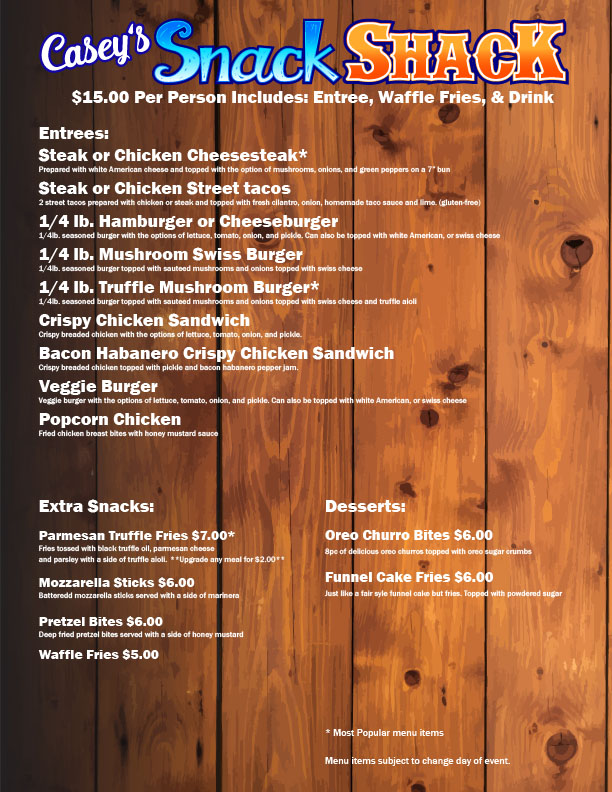 Casey's Snack Shack specializes in corporate events, employee appreciation, graduation parties, rehearsal dinners, late night snacks at weddings, birthday parties, as well as a limited number of public events and festivals.